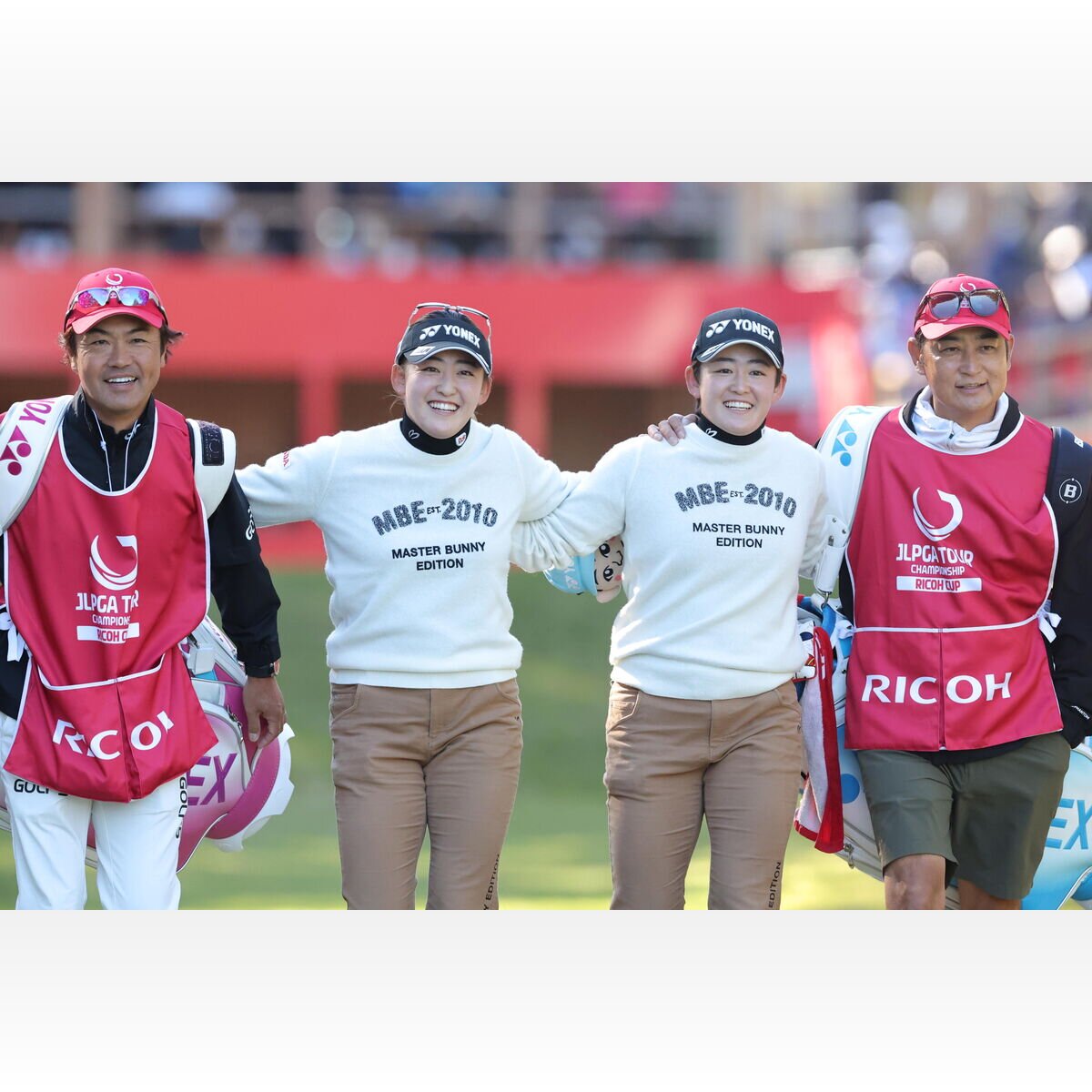 22日の夜にペアリングが決まり、「お互いの服を見ながら合わせられたらいいね」と話し合い、白いトレーナーとベージュの長ズボンでコーディネートしました。1番ホールのティーショット後は2人で肩を組み、コースへ歩き出しました。