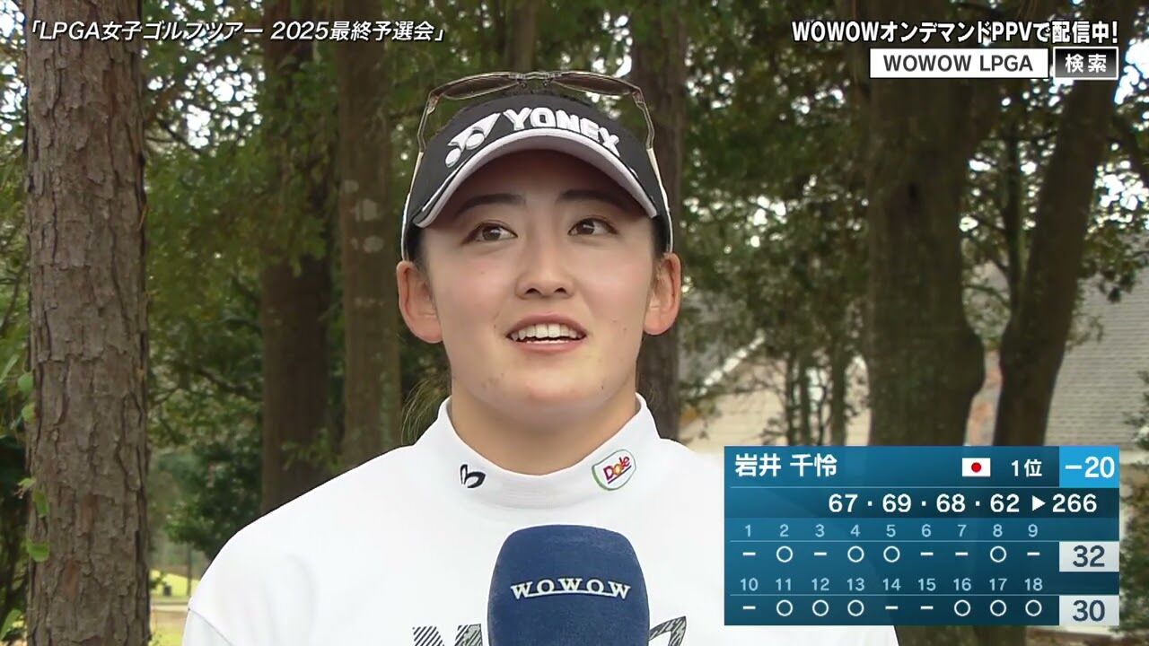 岩井千怜が通算20アンダーで単独首位に立ち、1打差で山下美夢有が2位を追走。通算14アンダーで7位タイの岩井明愛、13アンダーで9位の吉田優利も好調です。馬場咲希は4アンダーで25位タイと、来季のツアーカード獲得圏内にいます。