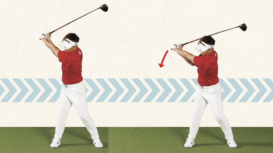 自然な手首のコック 大きなバックスイングでは、スイング中の遠心力で自然に手首のコックが生まれるため、無理に手首を使う必要はありません。